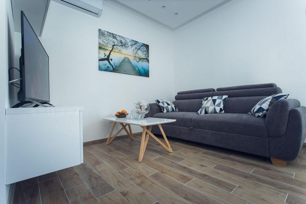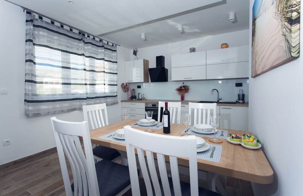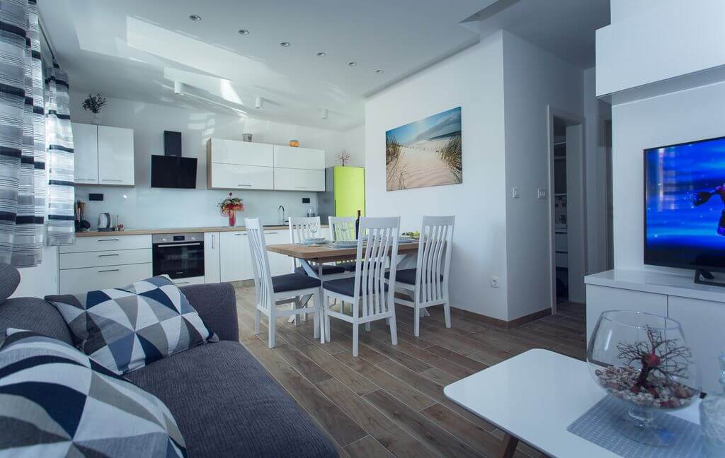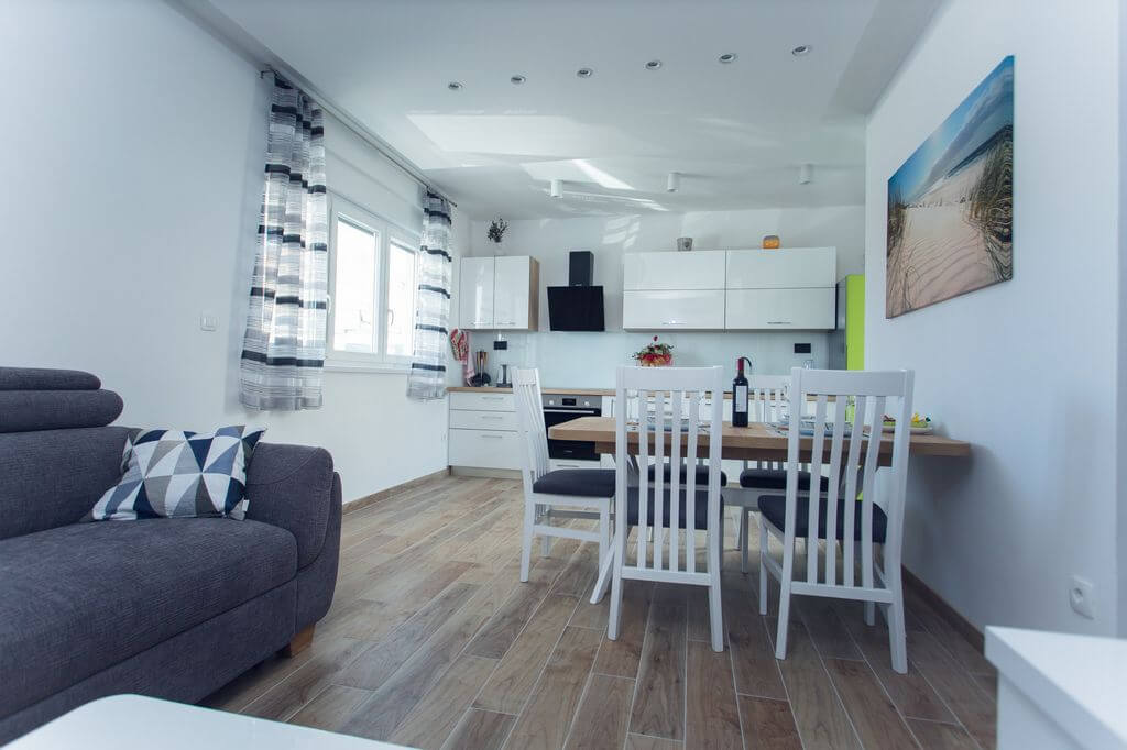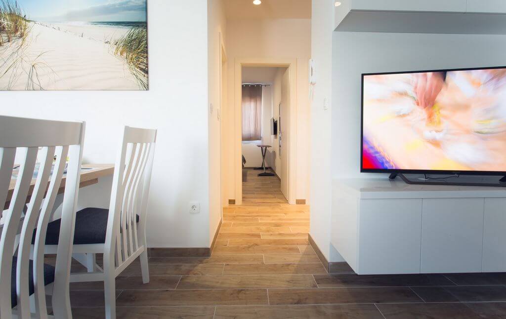 The apartment features 2 bedrooms equipped with a flat-screen TV with satellite channels. The comfortably furnished living / dining room will make your holiday relaxed and stress-free. The bathroom features the shower and washing machine. Fully-equipped kitchen with dishwasher offers direct access to the spacious sunny terrace with barbecue facilities. Enjoy your first morning coffee while sun from the east greets you on the terrace. The beauty of terrace lights at sunset are the best setting for an evening cocktail or glass of Dalmatian wine.