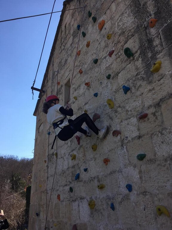 One of our activities is rock climbing on the 7-meter-high artificial rock or so-called climbing wall. The rock construction is suitable for all levels of climbers and offers different technical difficulties. Therefore, the participants are free to choose the level they want to try. This type of exercise is extremely useful to improve your body balance. All safety equipment is provided as well as a person securing the climbers while being active on the wall.